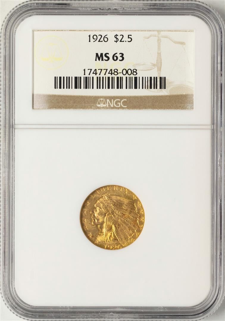 One 1926 $2 1/2 Indian Head Quarter Eagle Gold Coin NGC MS63. NGC Certified.
