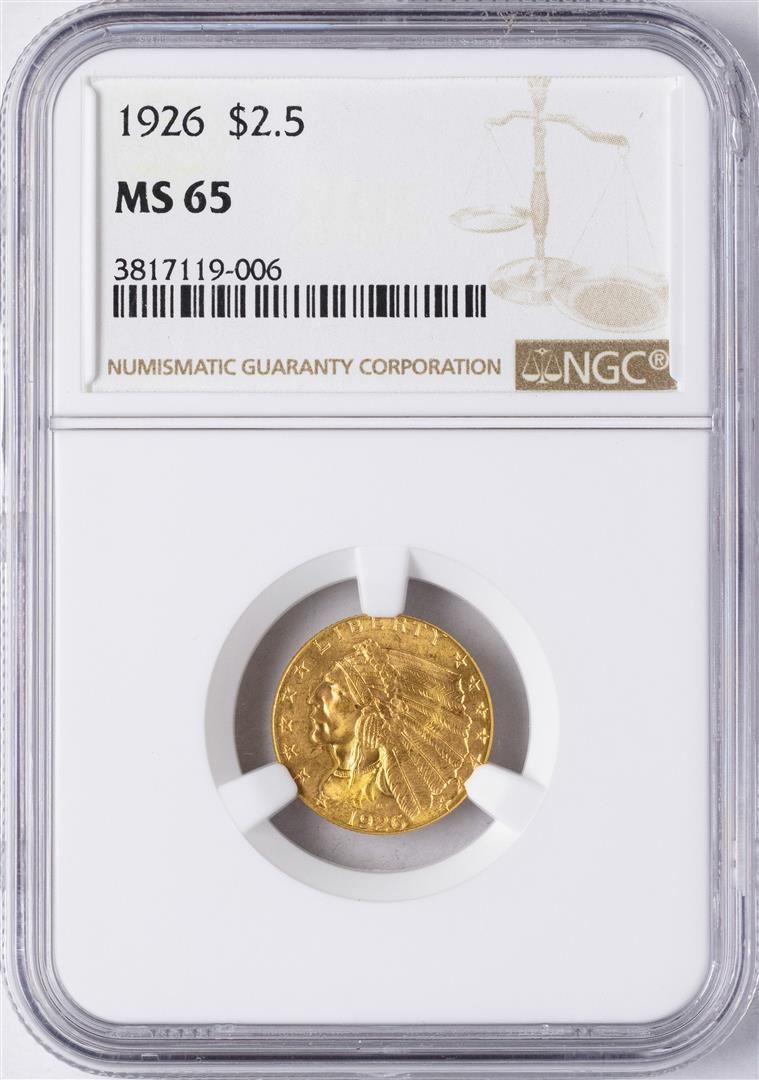 One 1926 $2 1/2 Indian Head Quarter Eagle Gold Coin NGC MS65. NGC Certified.