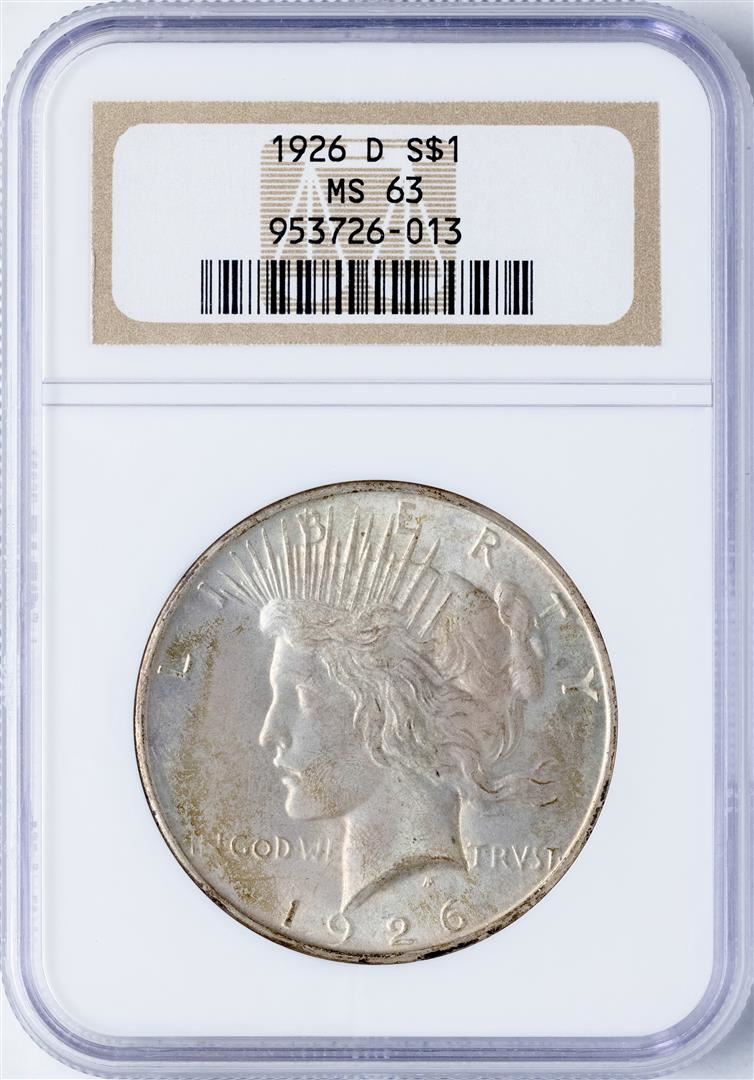One 1926-D $1 Peace Silver Dollar Coin NGC MS63. NGC Certified.