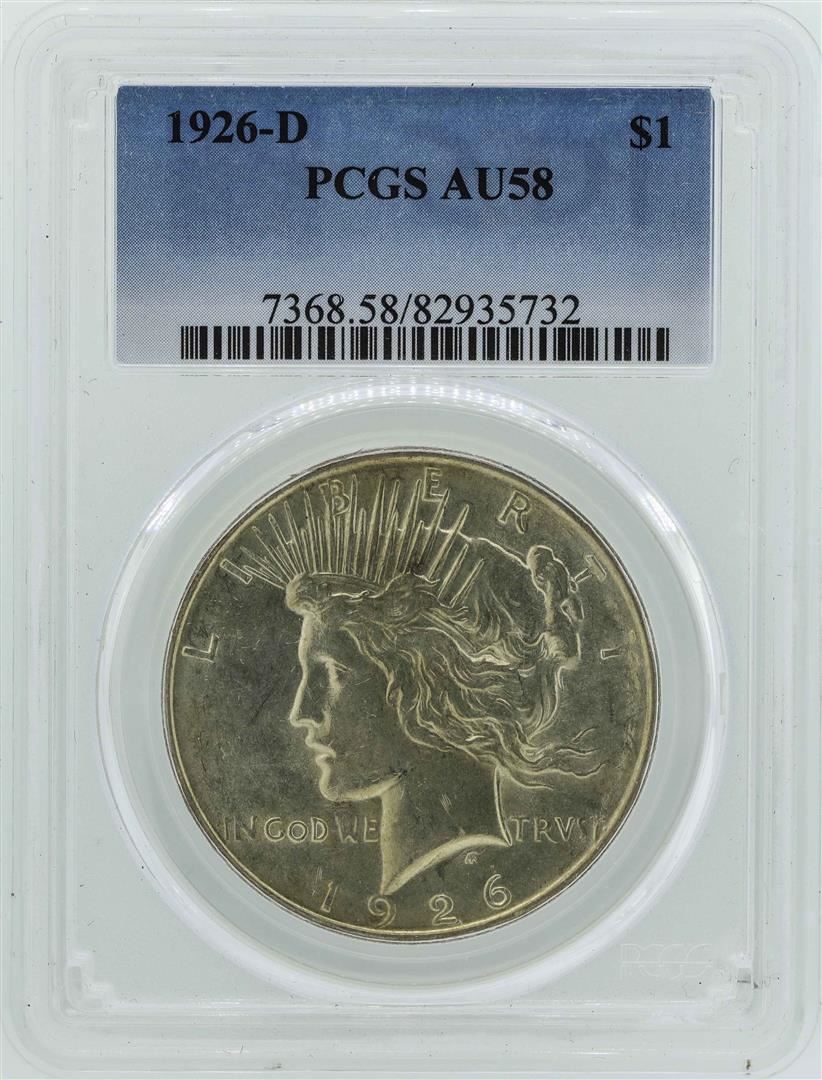 One 1926-D $1 Peace Silver Dollar Coin PCGS AU58. PCGS Graded.