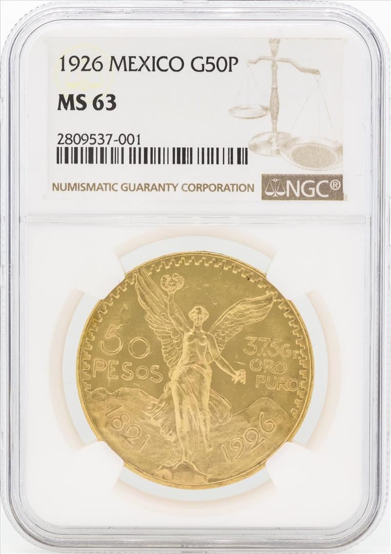 One 1926 Mexico 50 Pesos Gold Coin NGC MS63. NGC Certified.