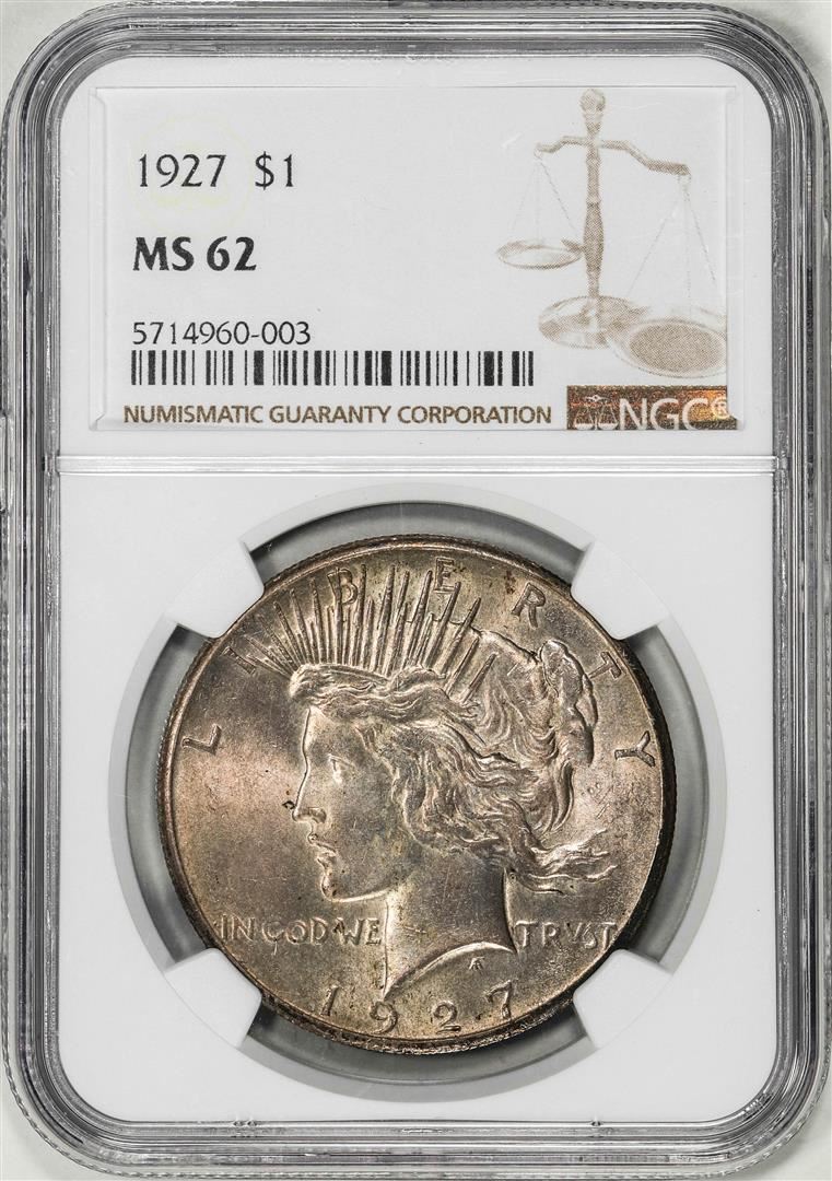 One 1927 $1 Peace Silver Dollar Coin NGC MS62. NGC Certified.