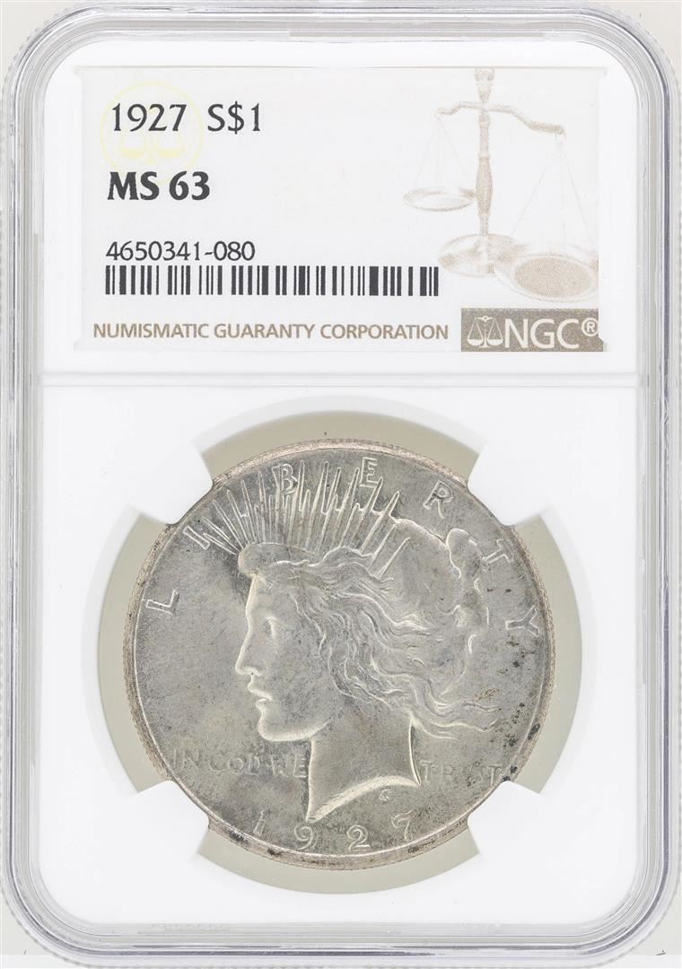 One 1927 $1 Peace Silver Dollar Coin NGC MS63. NGC Certified.