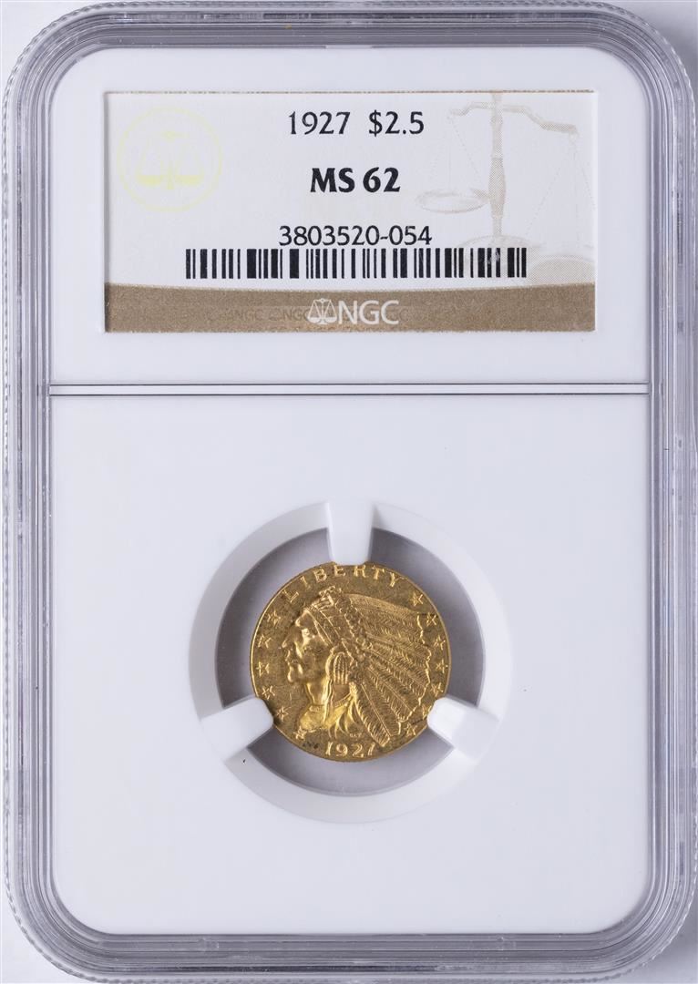 One 1927 $2 1/2 Indian Head Quarter Eagle Gold Coin NGC MS62. NGC Certified.