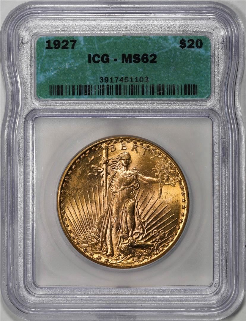 One 1927 $20 St. Gaudens Double Eagle Gold Coin ICG MS62. ICG Certified.