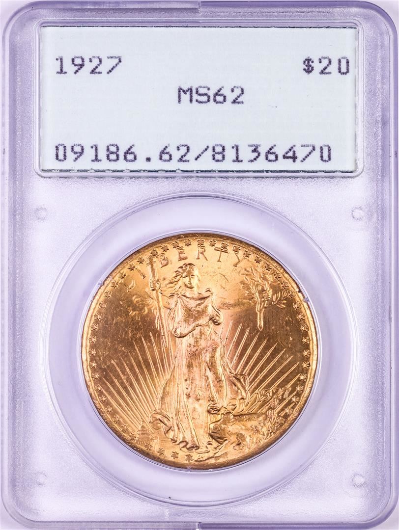 One 1927 $20 St. Gaudens Double Eagle Gold Coin PCGS MS62 Green Rattler Holder. PCGS Graded.