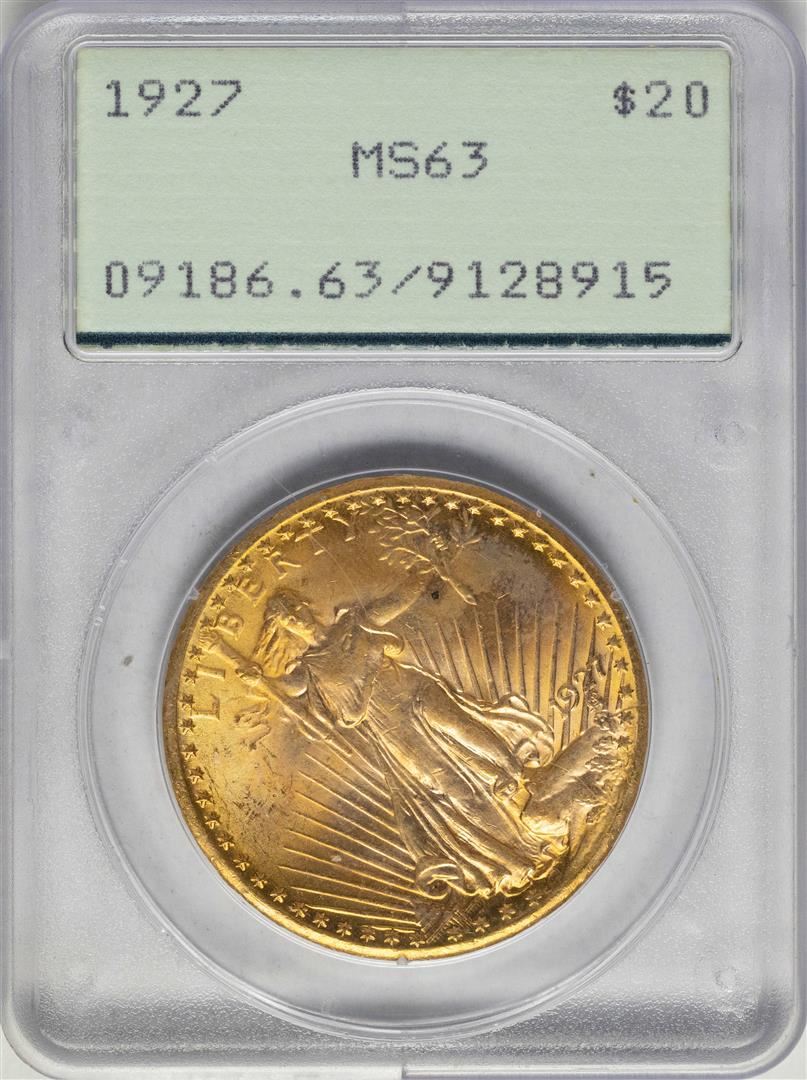 One 1927 $20 St. Gaudens Double Eagle Gold Coin PCGS MS63 Old Green Holder. PCGS Graded.