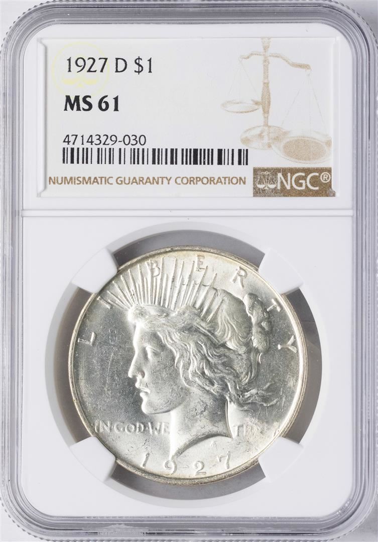 One 1927-D $1 Peace Silver Dollar Coin NGC MS61. NGC Certified.