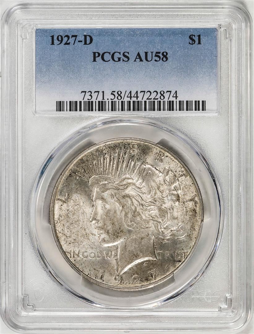 One 1927-D $1 Peace Silver Dollar Coin PCGS AU58. PCGS Graded.