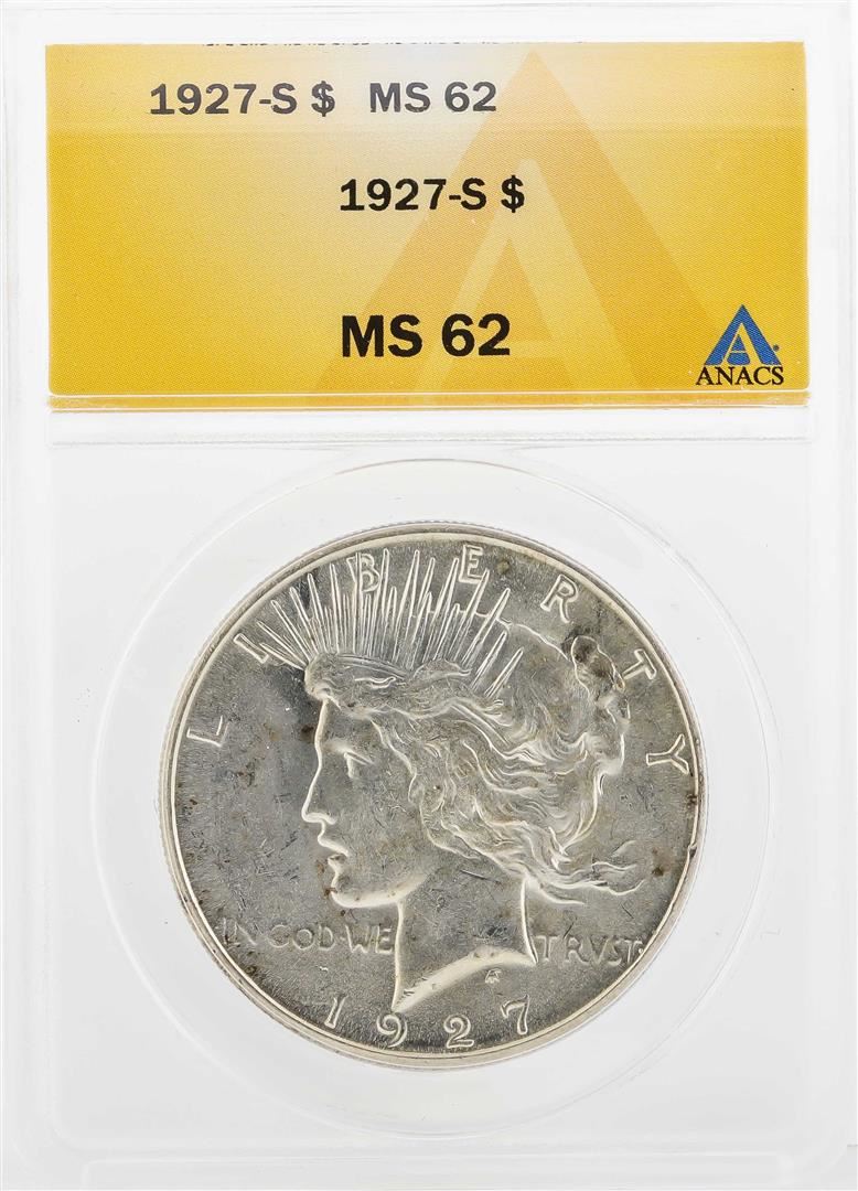 One 1927-S $1 Peace Silver Dollar Coin ANACS MS62. ANACS Certified.