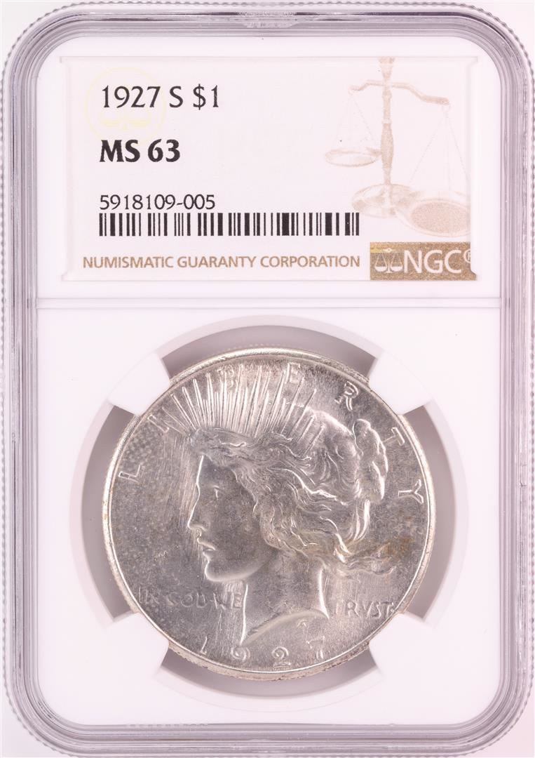 One 1927-S $1 Peace Silver Dollar Coin NGC MS63. NGC Certified.