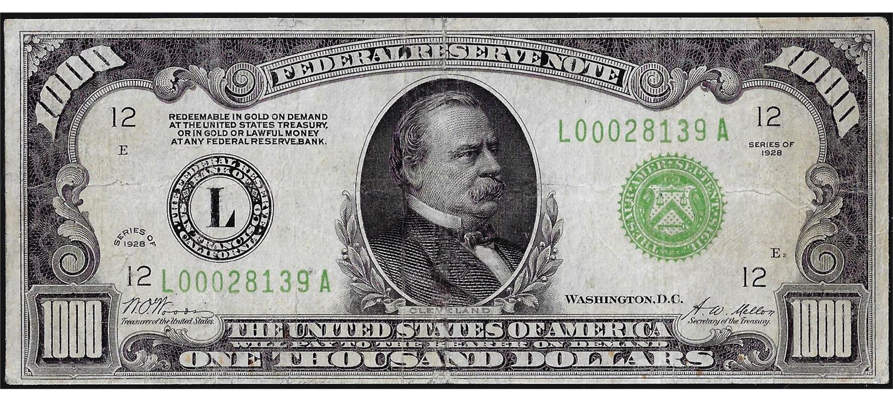 One 1928 $1,000 Federal Reserve Note San Francisco.