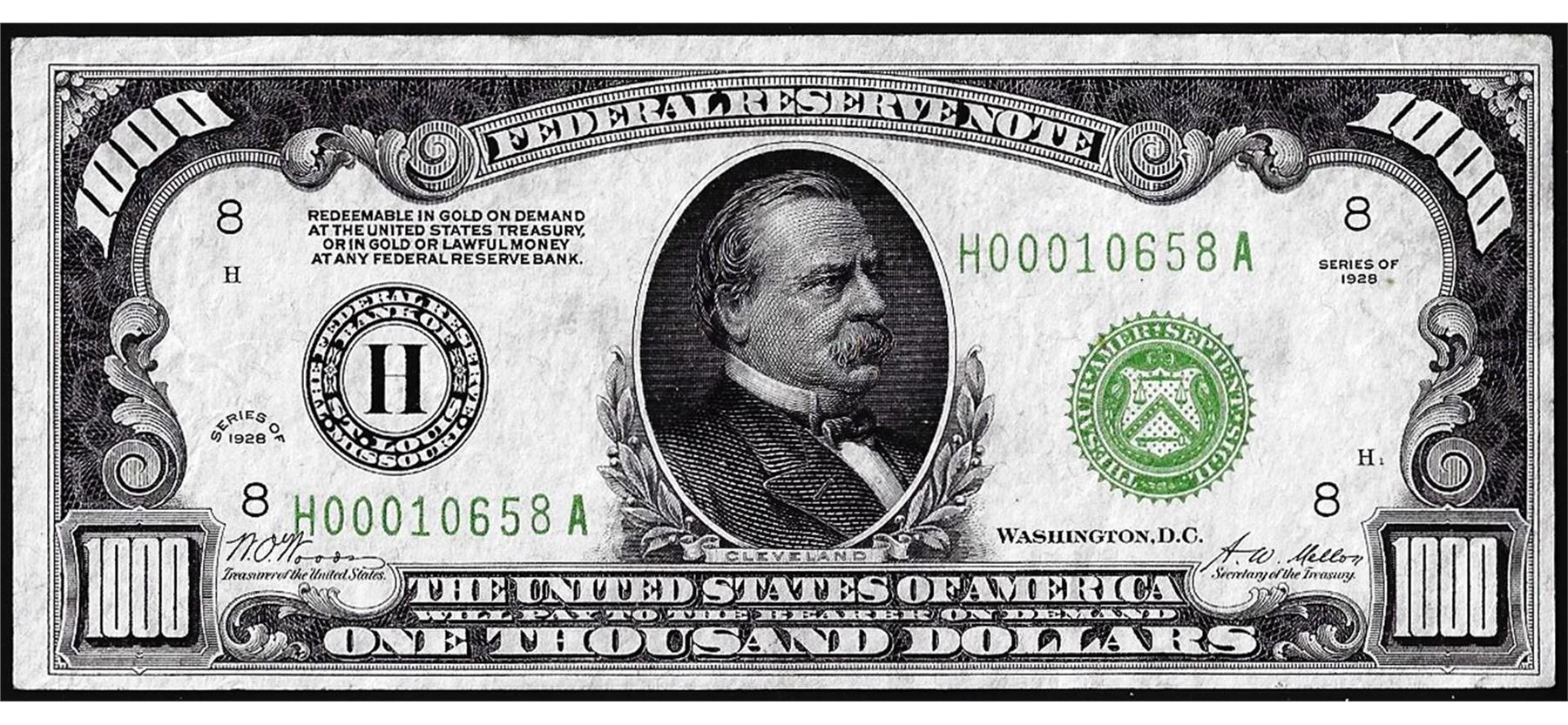 One 1928 $1,000 Federal Reserve Note St. Louis.