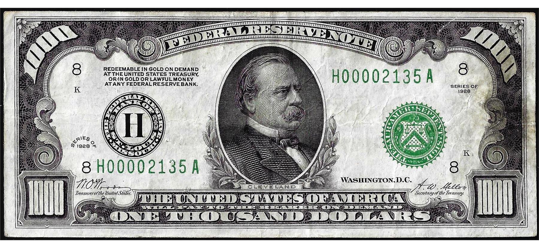 One 1928 $1,000 Federal Reserve Note St. Louis.