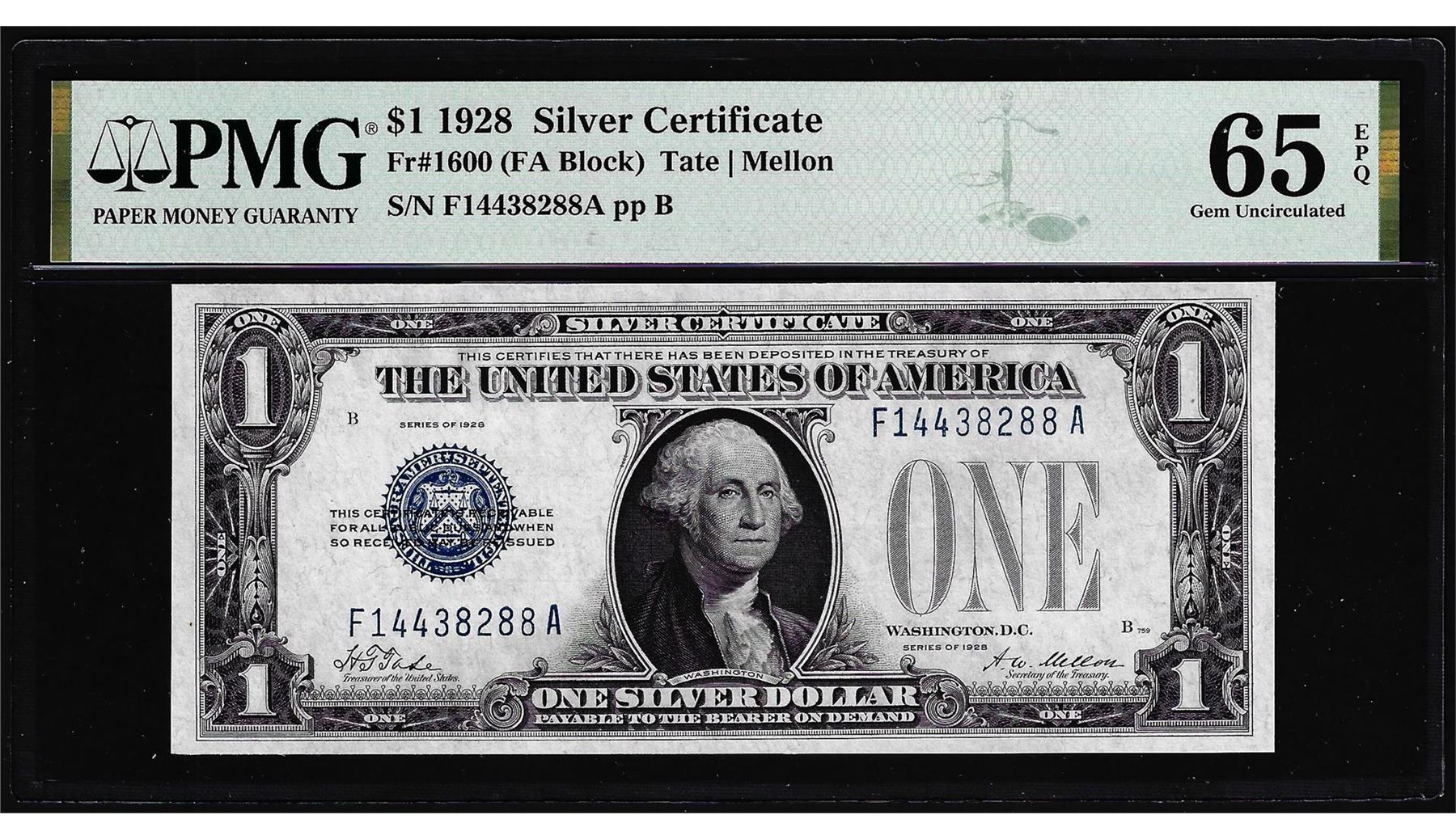 One 1928 $1 Funnyback Silver Certificate Note Fr.1600 PMG Gem Uncirculated 65EPQ. PMG Certified.