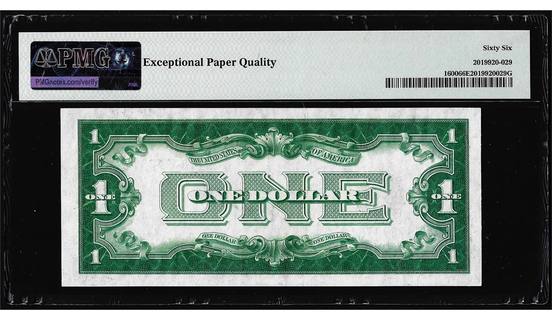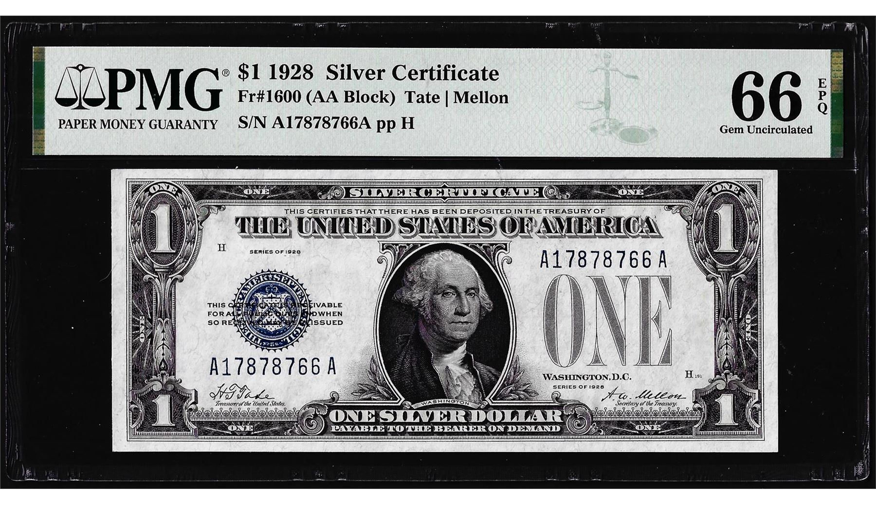 One 1928 $1 Funnyback Silver Certificate Note Fr.1600 PMG Gem Uncirculated 66EPQ. PMG Certified.