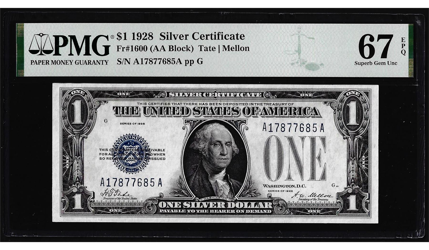 One 1928 $1 Funnyback Silver Certificate Note Fr.1600 PMG Superb Gem Uncirculated 67EPQ. PMG Certified.
