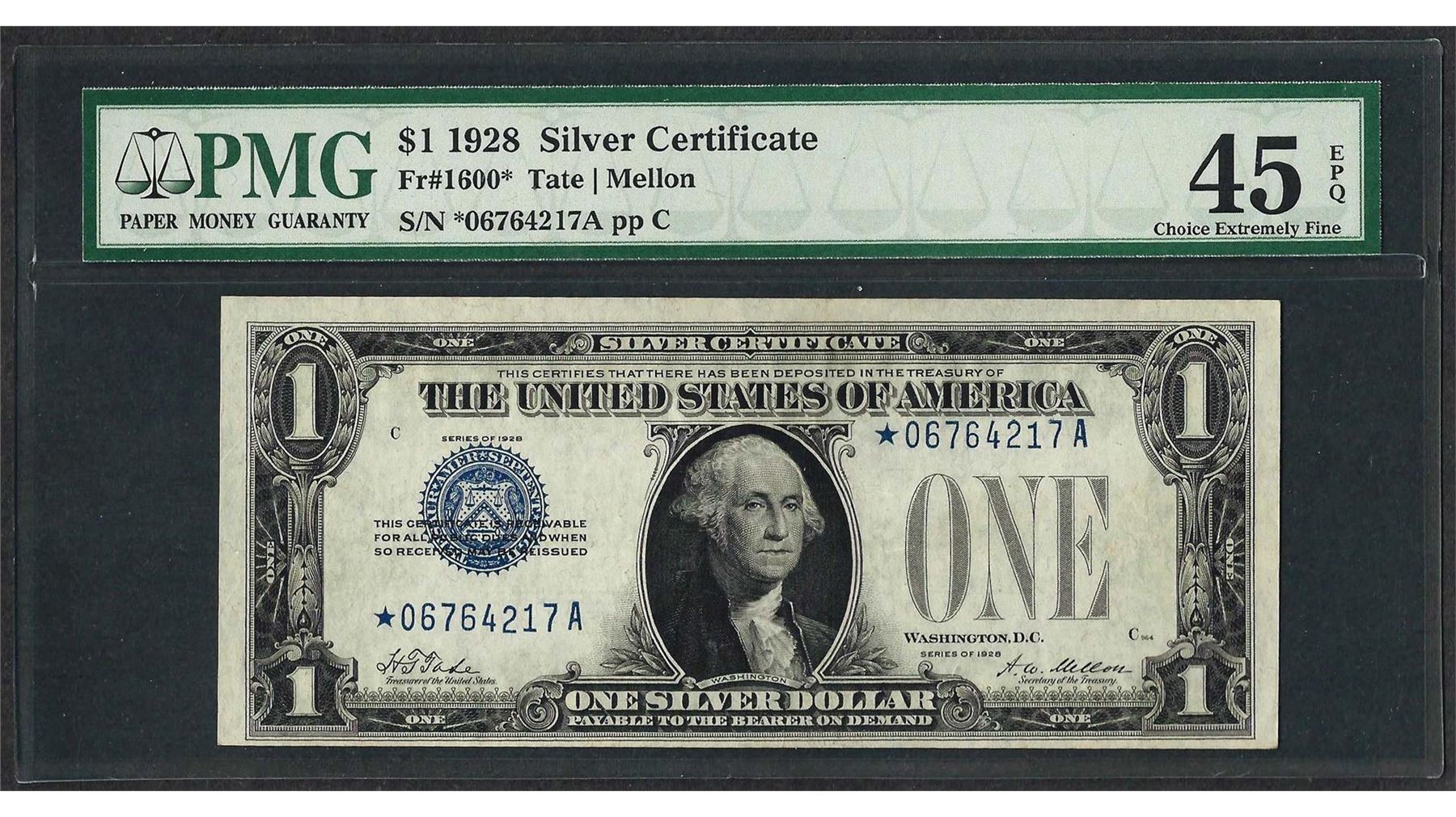 One 1928 $1 Funnyback Silver Certificate STAR Note PMG Choice Extremely Fine 45EPQ. PMG Certified.