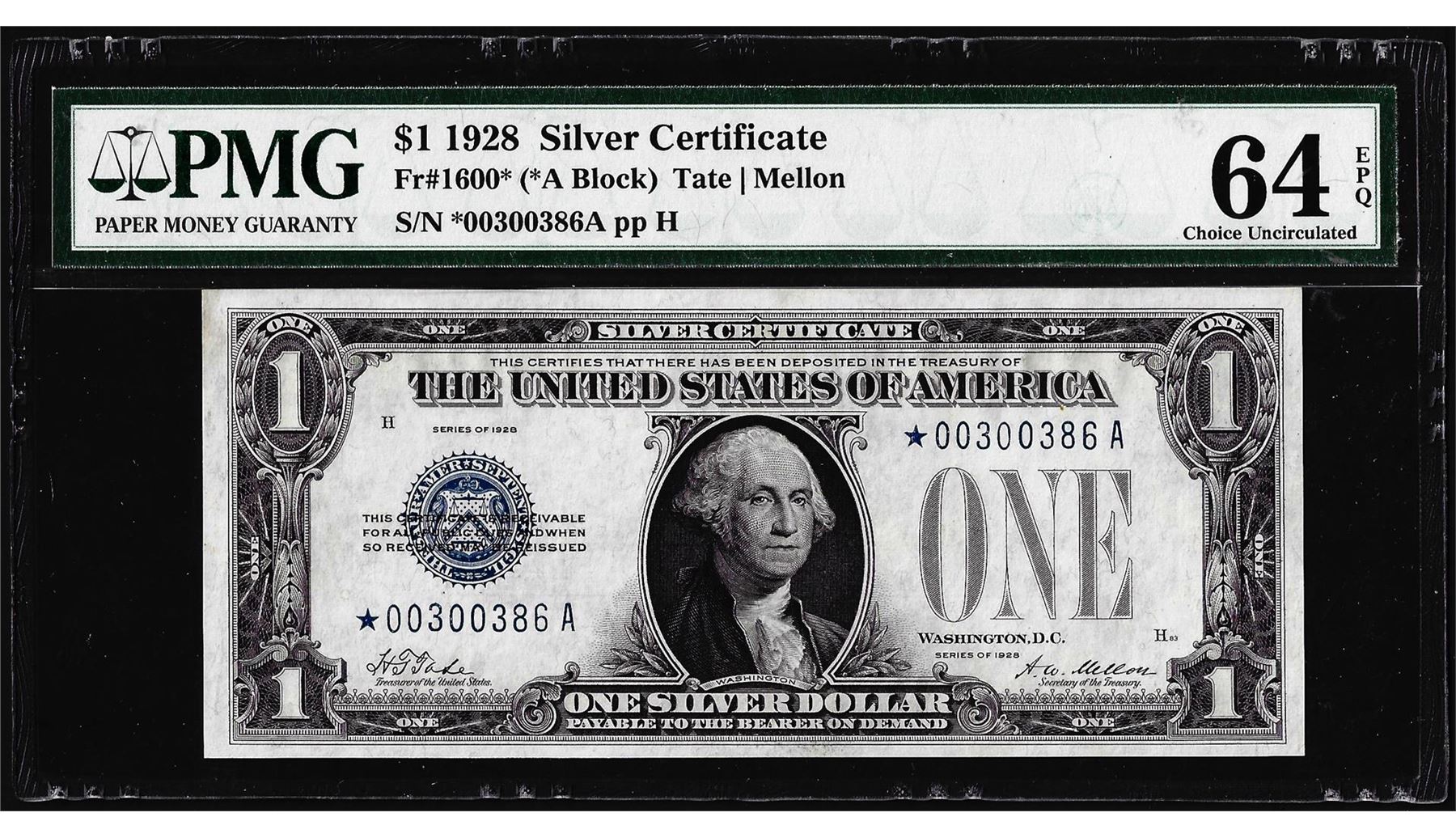 One 1928 $1 Funnyback Silver Certificate Star Note Fr.1600* PMG Choice Uncirculated 64EPQ. PMG Certified.