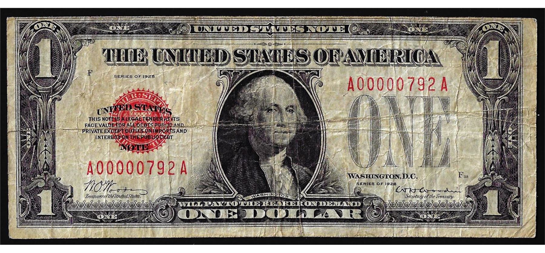 One 1928 $1 Legal Tender Note 3 Digit Serial Number.