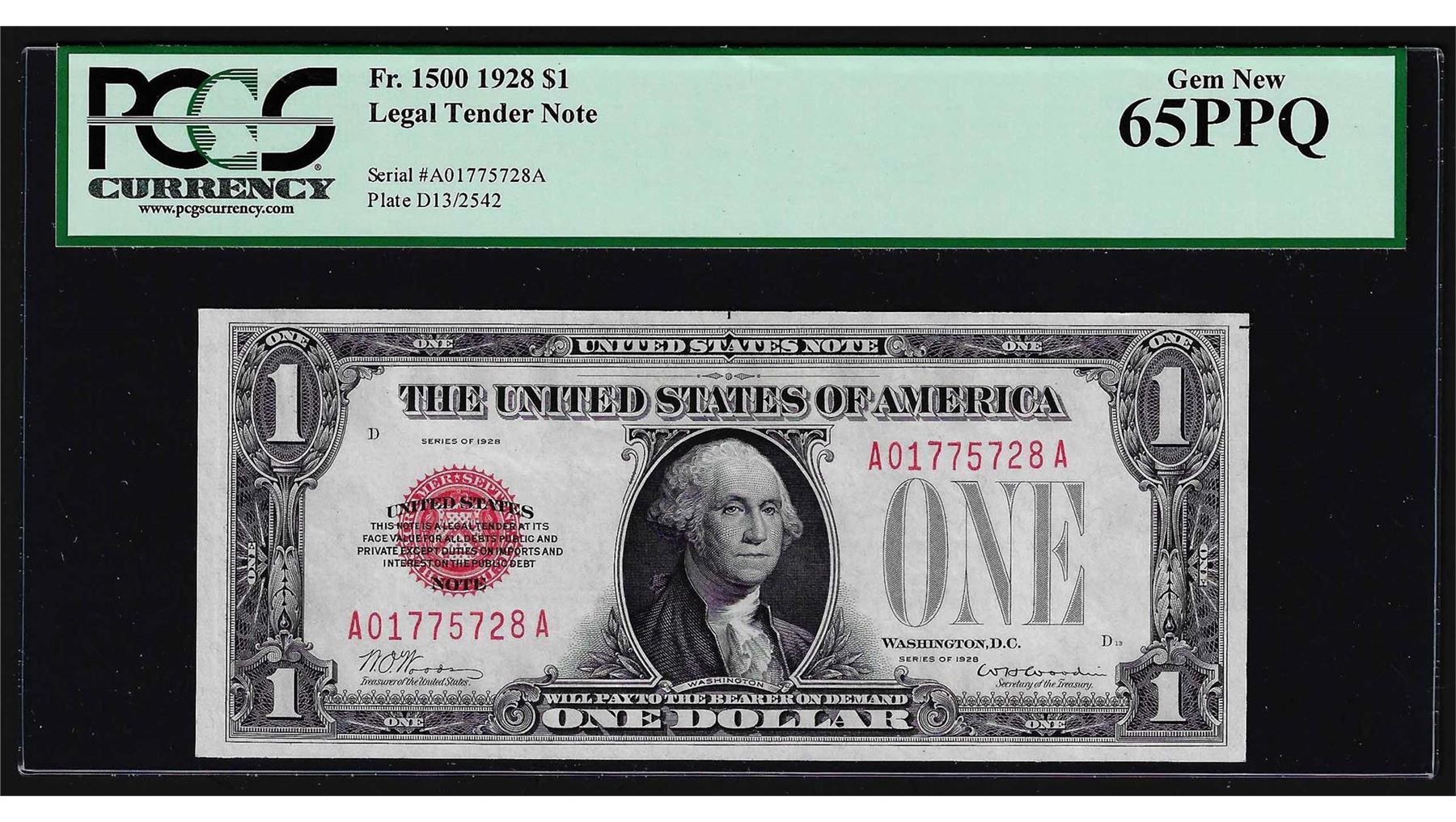One 1928 $1 Legal Tender Red Seal Note PCGS Gem New 65PPQ. PCGS Graded.