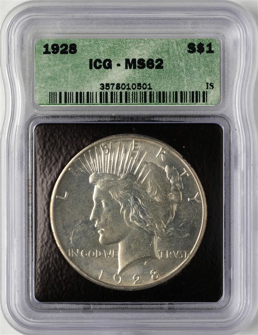 One 1928 $1 Peace Silver Dollar Coin ICG MS62. ICG Certified.