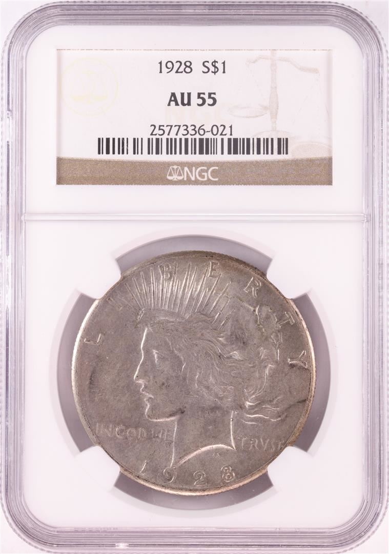 One 1928 $1 Peace Silver Dollar Coin NGC AU55. NGC Certified.