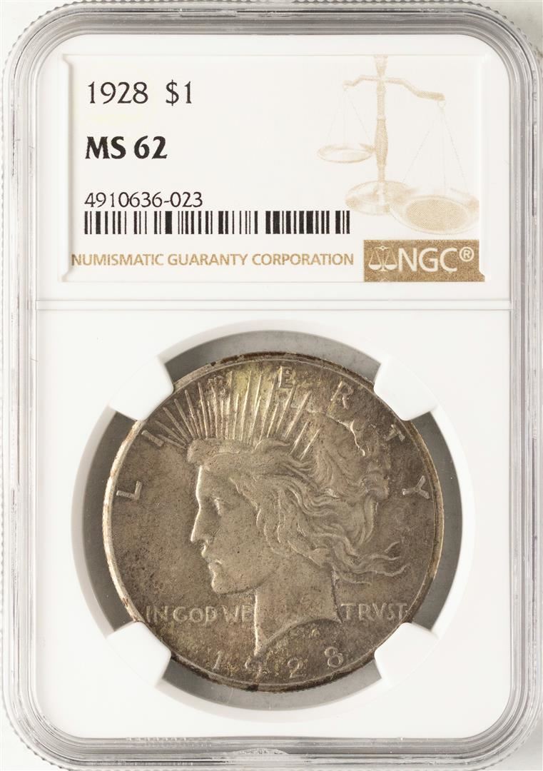 One 1928 $1 Peace Silver Dollar Coin NGC MS62. NGC Certified.