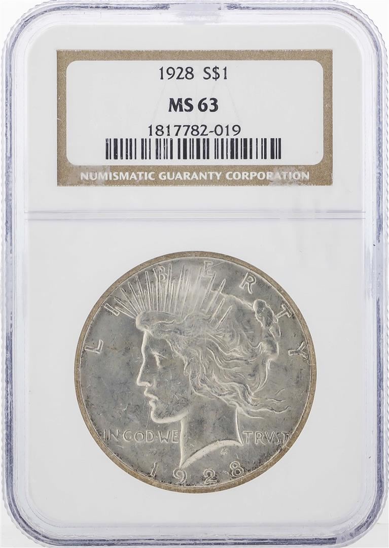 One 1928 $1 Peace Silver Dollar Coin NGC MS63. NGC Certified.