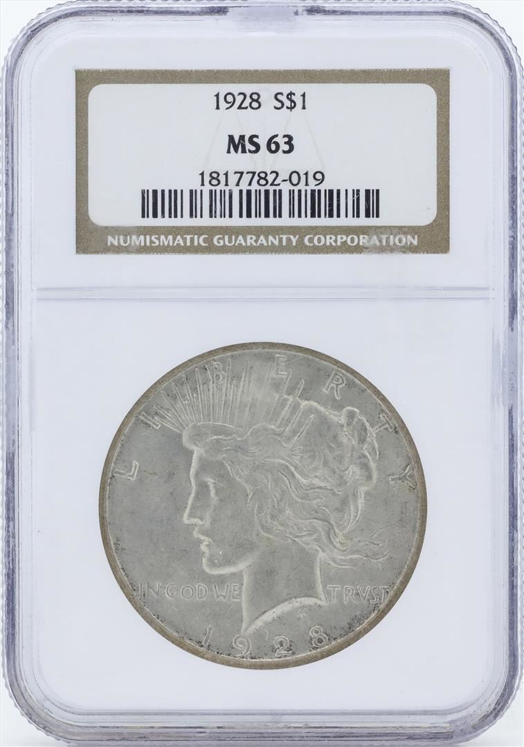 One 1928 $1 Peace Silver Dollar Coin NGC MS63. NGC Certified.