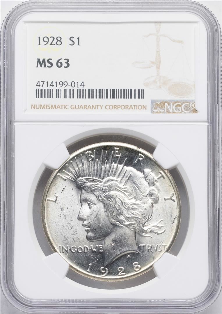 One 1928 $1 Peace Silver Dollar Coin NGC MS63. NGC Certified.