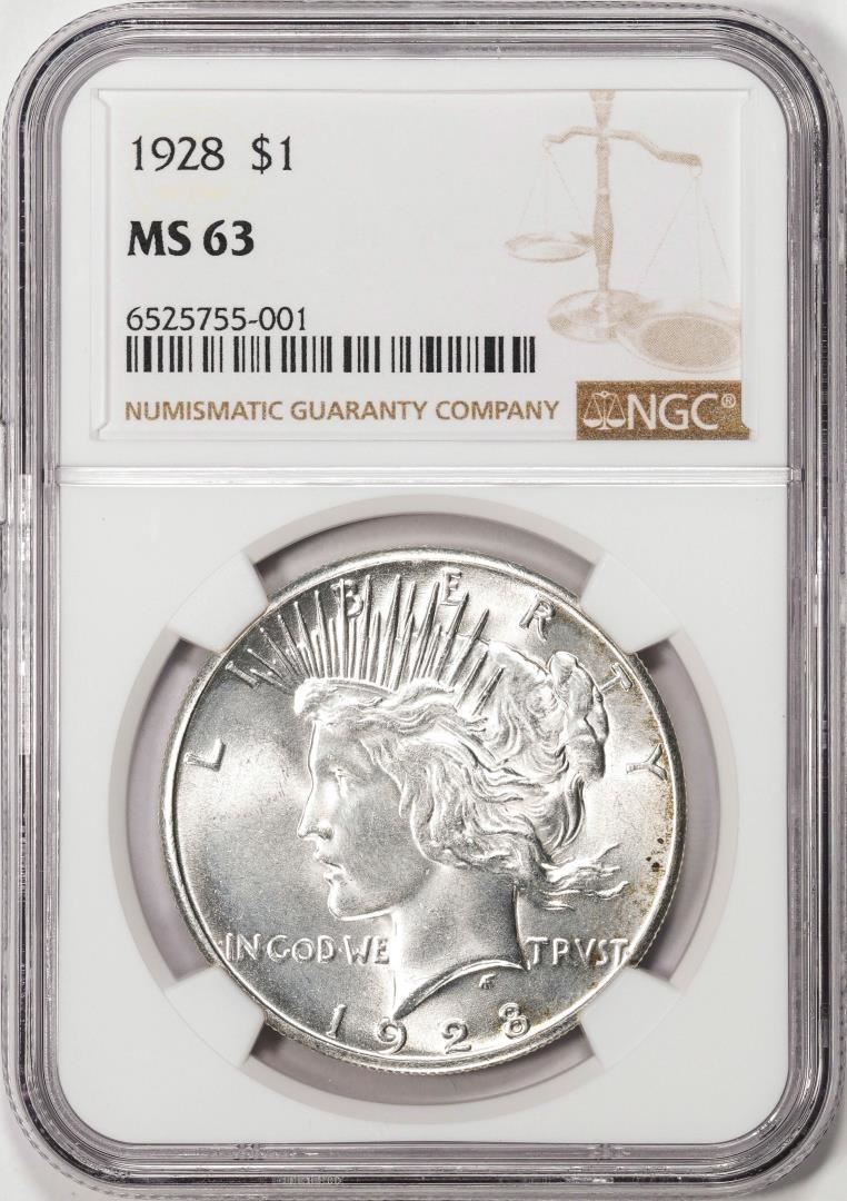 One 1928 $1 Peace Silver Dollar Coin NGC MS63. NGC Certified.