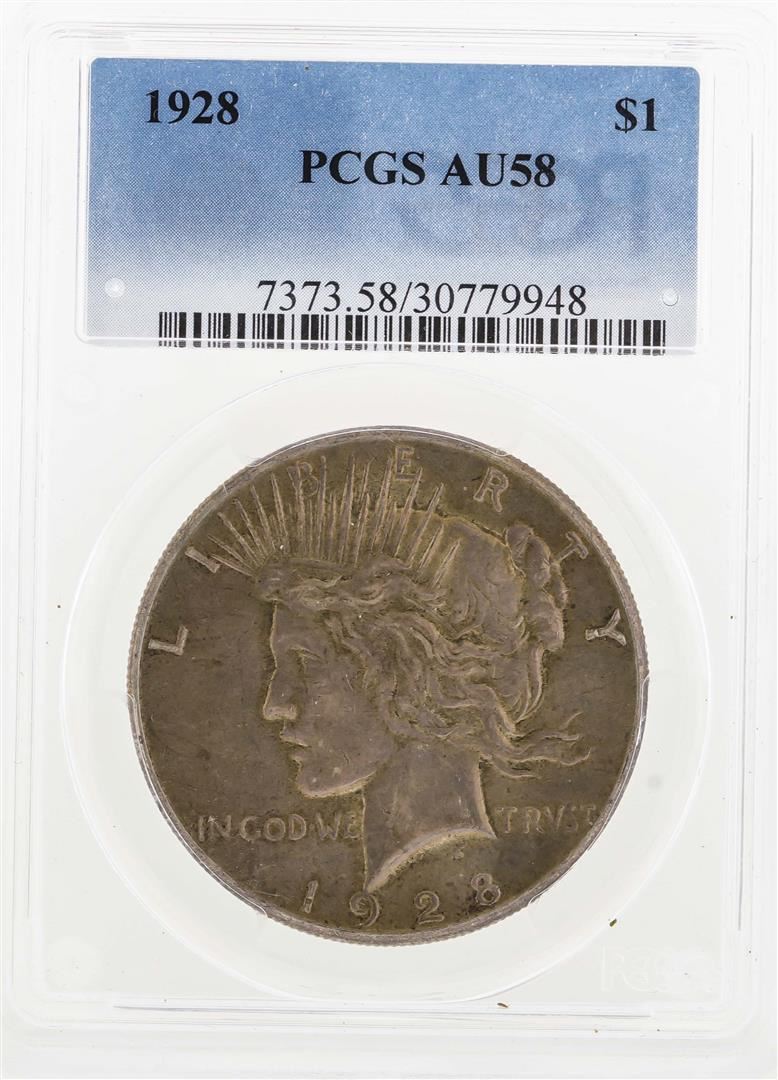 One 1928 $1 Peace Silver Dollar Coin PCGS AU58. PCGS Graded.