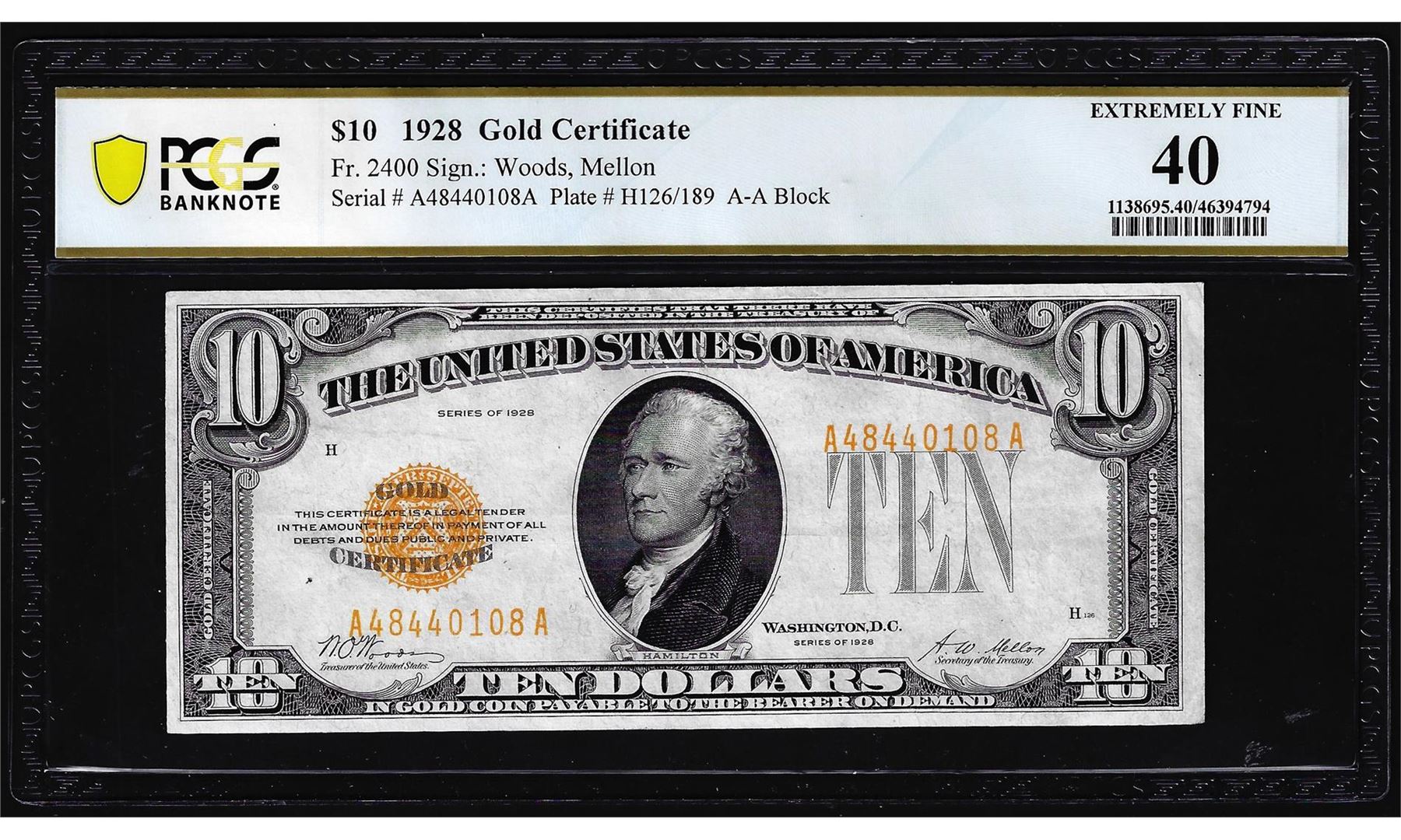 One 1928 $10 Gold Certificate Note Fr.2400 PCGS Extremely Fine 40. PCGS Graded.