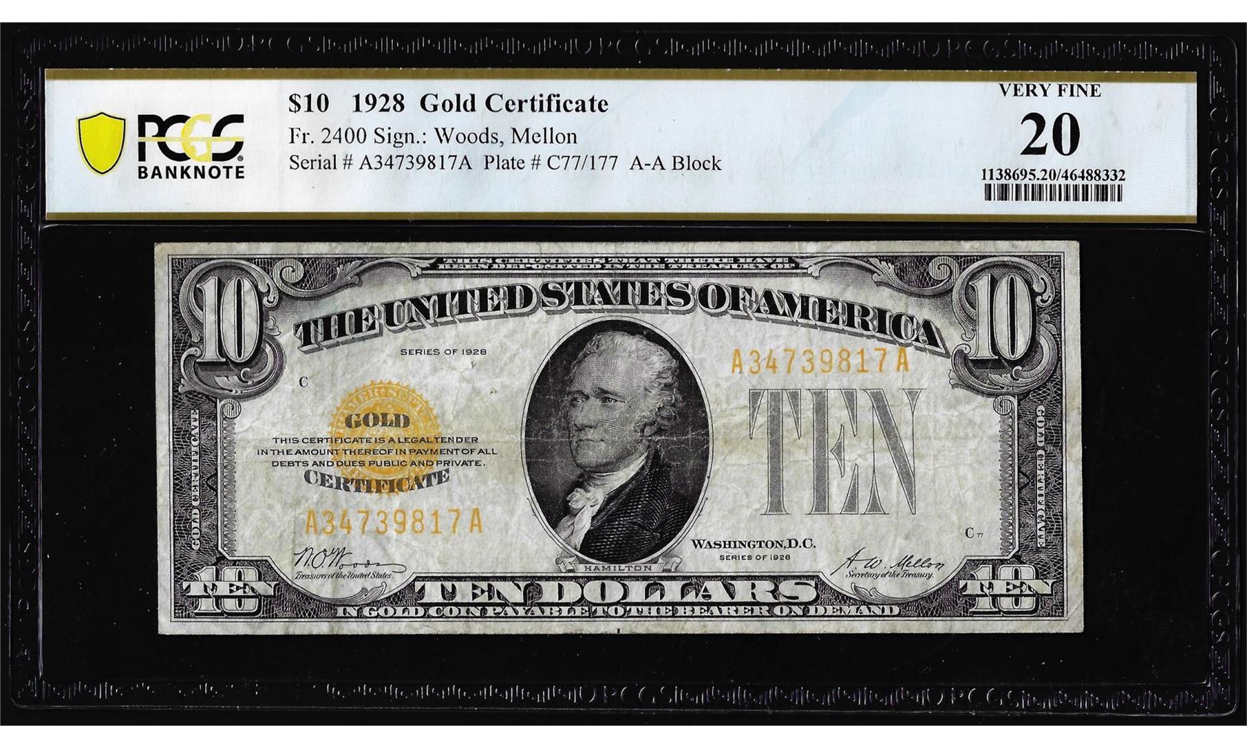One 1928 $10 Gold Certificate Note Fr.2400 PCGS Very Fine 20. PCGS Graded.