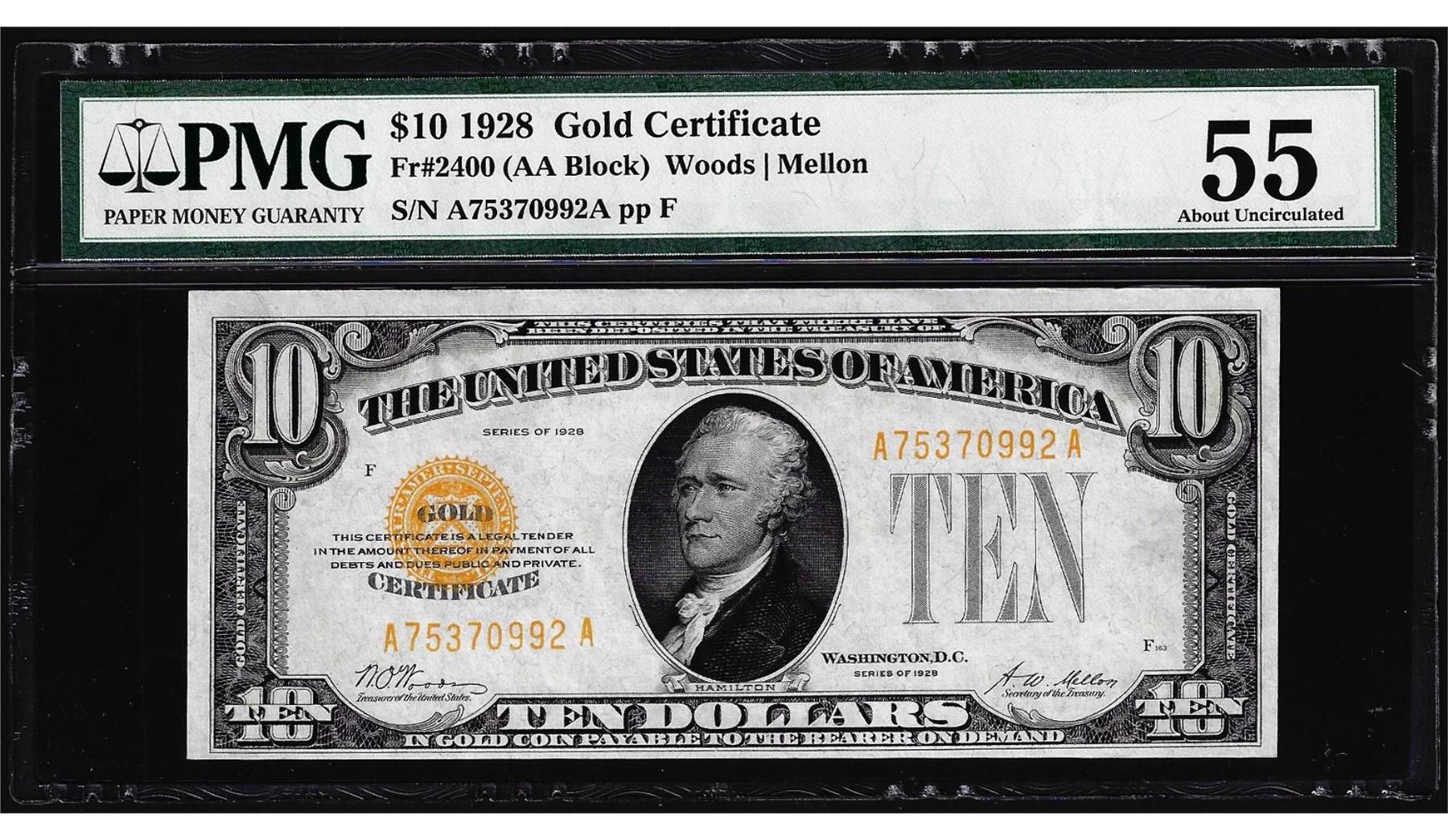 One 1928 $10 Gold Certificate Note Fr.2400 PMG About Uncirculated 55. PMG Certified.