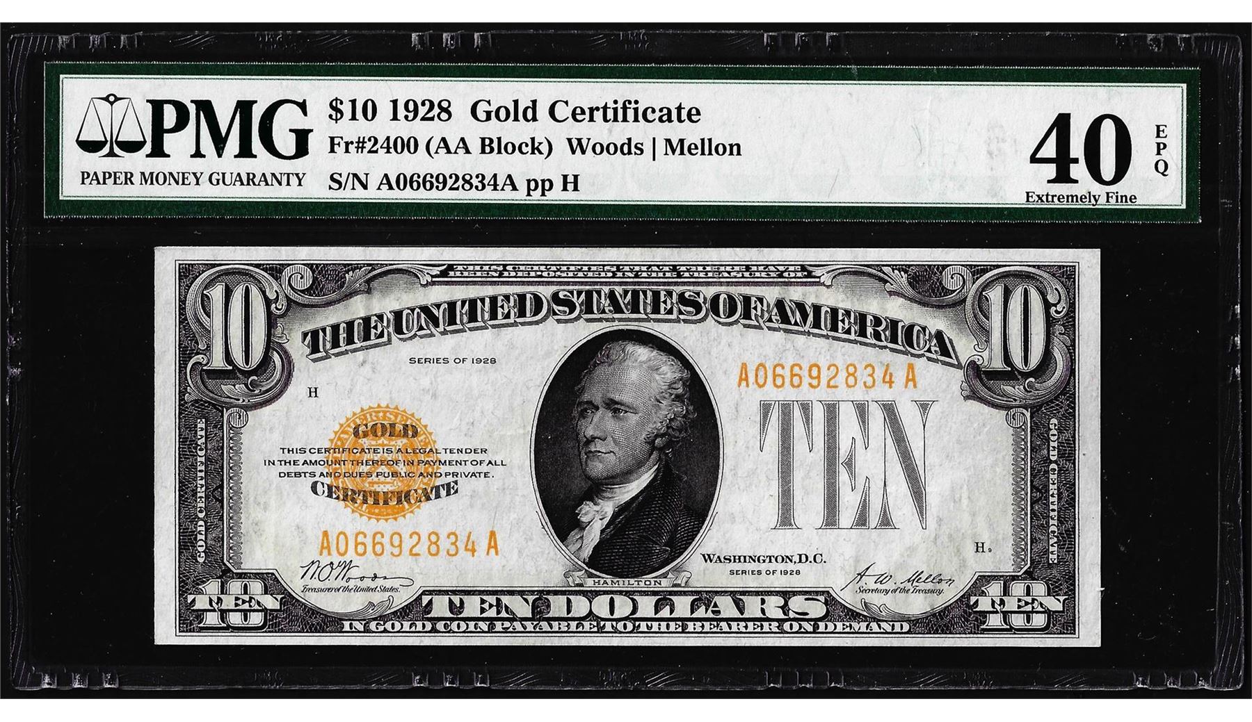 1928 $10 Gold Certificate Note Fr.2400 PMG Extremely Fine 40EPQ