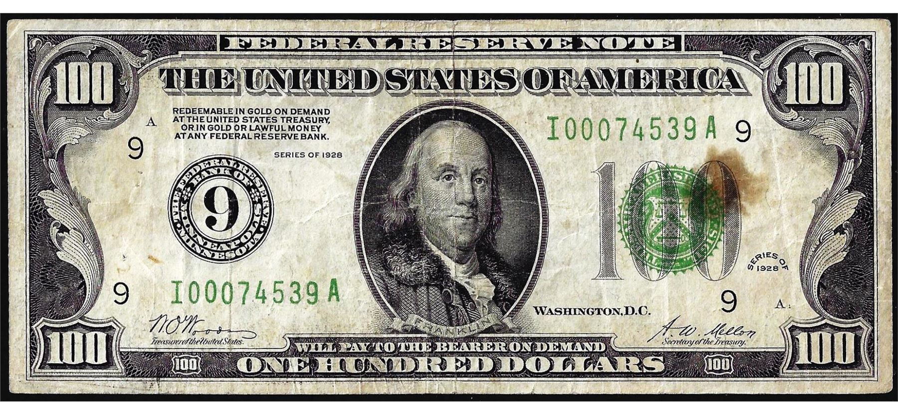 One 1928 $100 Federal Reserve Note Minneapolis.