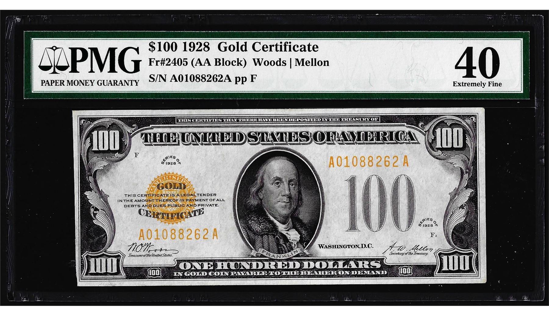 1928 $100 Gold Certificate Note Fr.2405 PMG Extremely Fine 40