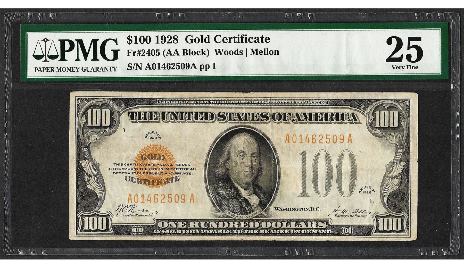 One 1928 $100 Gold Certificate Note Fr.2405 PMG Very Fine 25. PMG Certified.