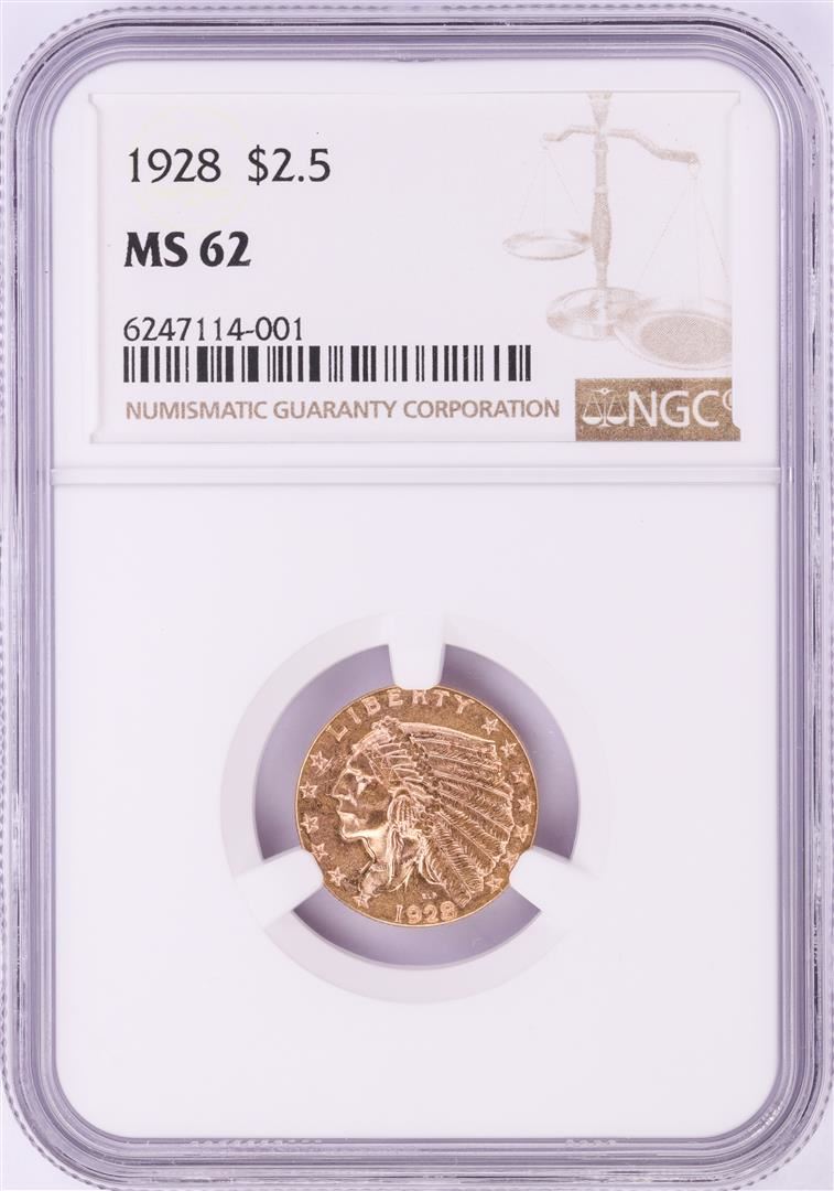 One 1928 $2 1/2 Indian Head Quarter Eagle Gold Coin NGC MS62. NGC Certified.