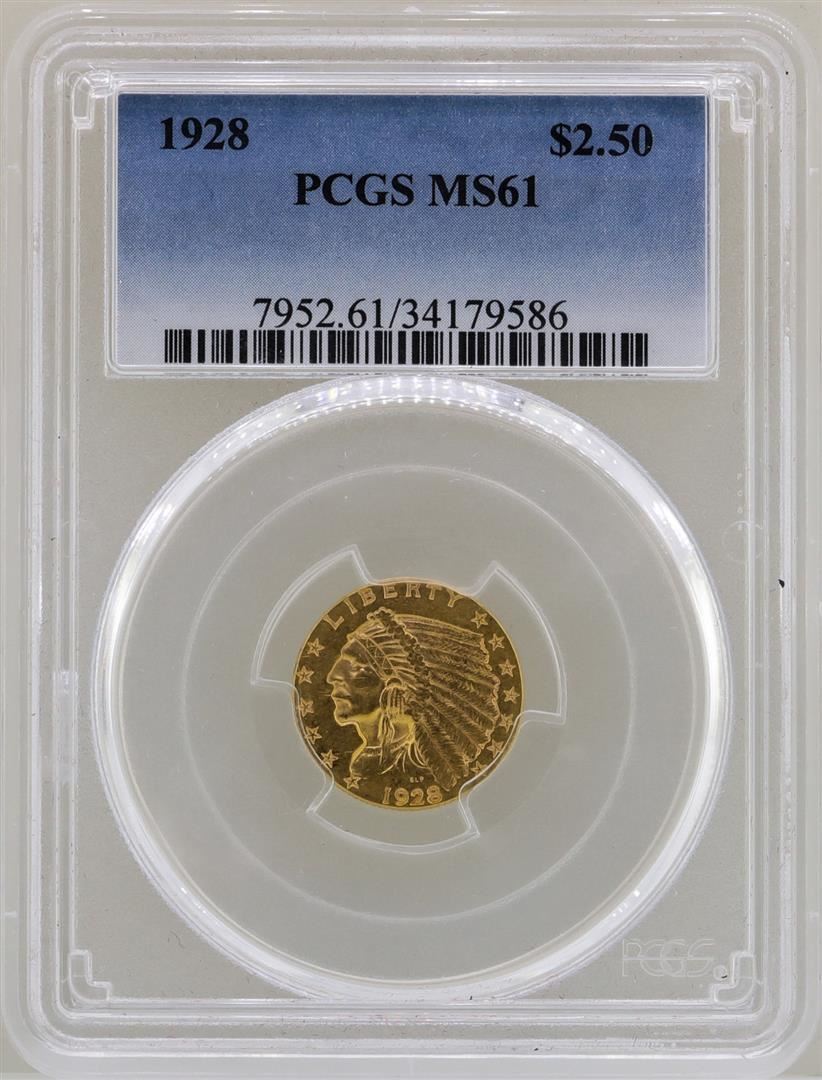 One 1928 $2 1/2 Indian Head Quarter Eagle Gold Coin PCGS MS61. PCGS Graded.
