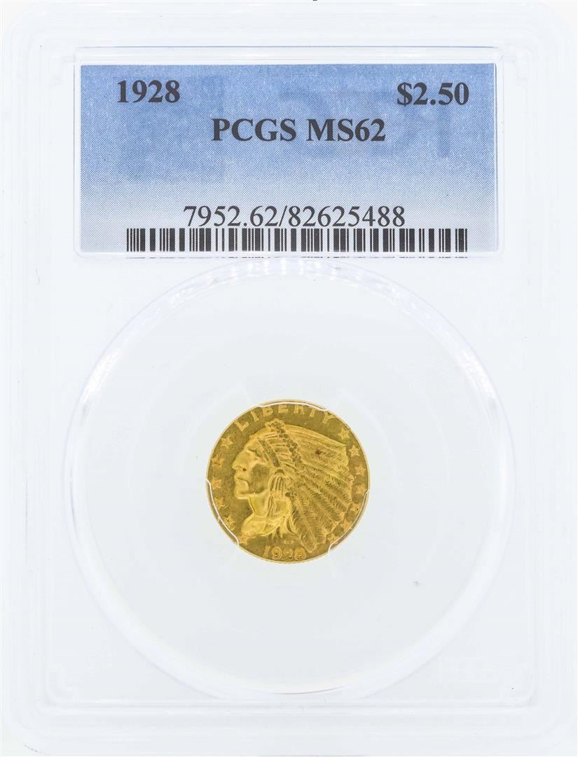 One 1928 $2 1/2 Indian Head Quarter Eagle Gold Coin PCGS MS62. PCGS Graded.