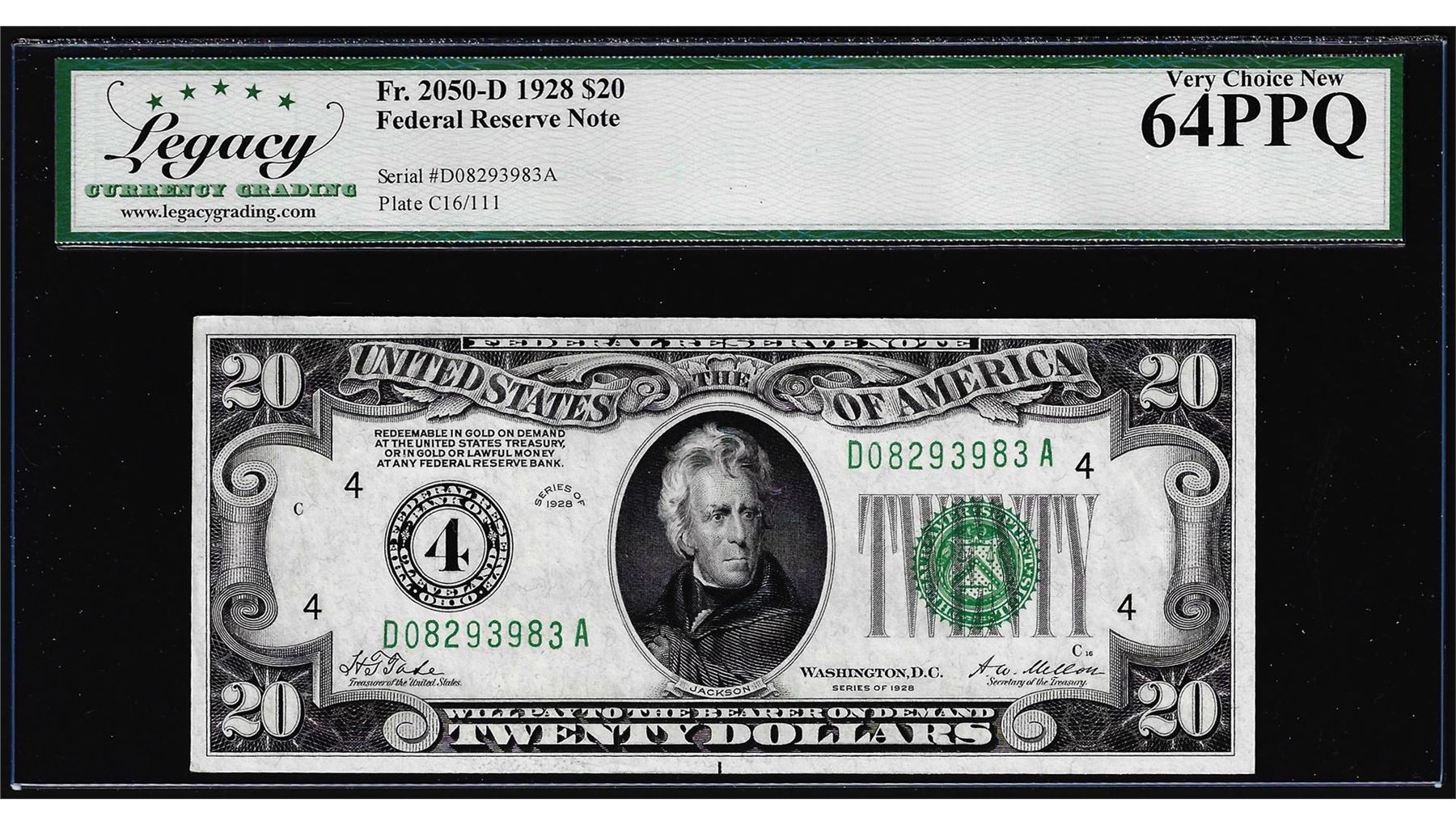 One 1928 $20 Federal Reserve Note Cleveland Fr.2050-D Legacy Very Choice New 64PPQ. Legacy Graded.