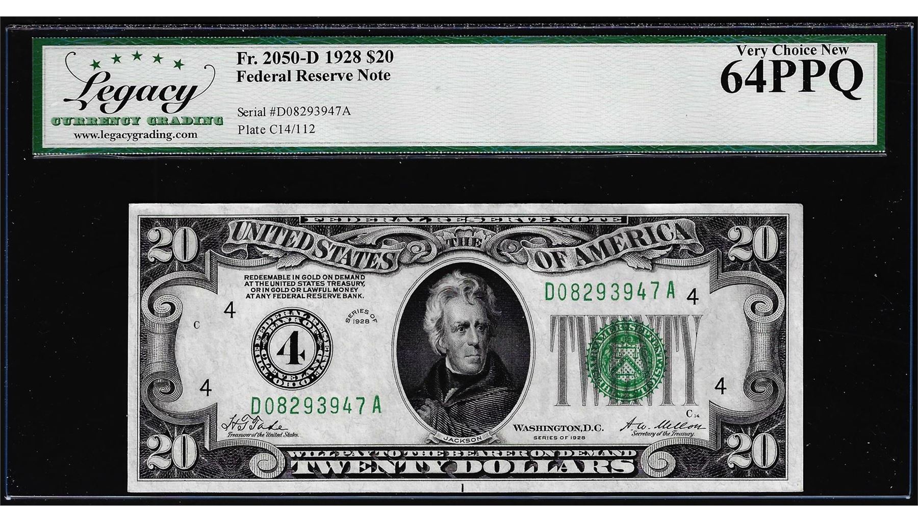 One 1928 $20 Federal Reserve Note Cleveland Fr.2050-D Legacy Very Choice New 64PPQ. Legacy Graded.