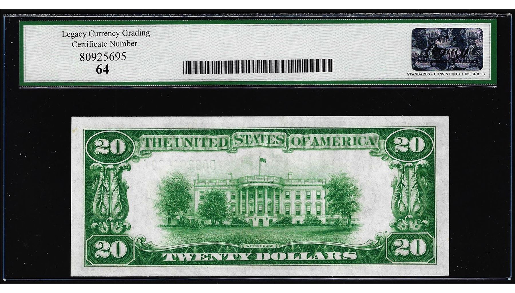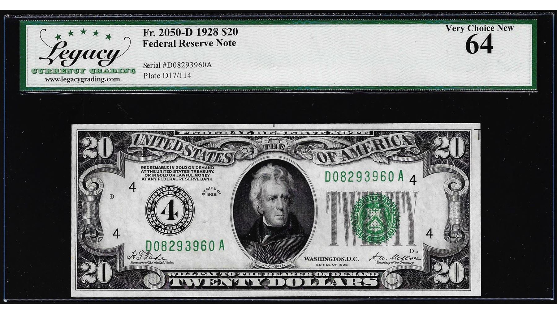 One 1928 $20 Federal Reserve Note Cleveland Fr.2050-D Legacy Very Choice New 64. Legacy Graded.