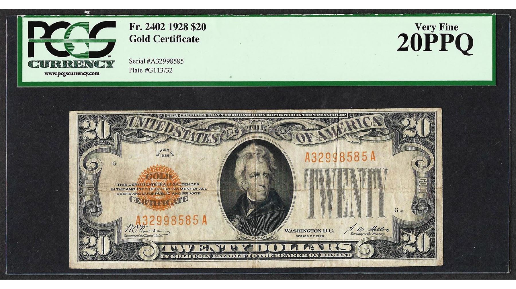 One 1928 $20 Gold Certificate Note Fr.2402 PCGS Very Fine 20PPQ. PCGS Graded.