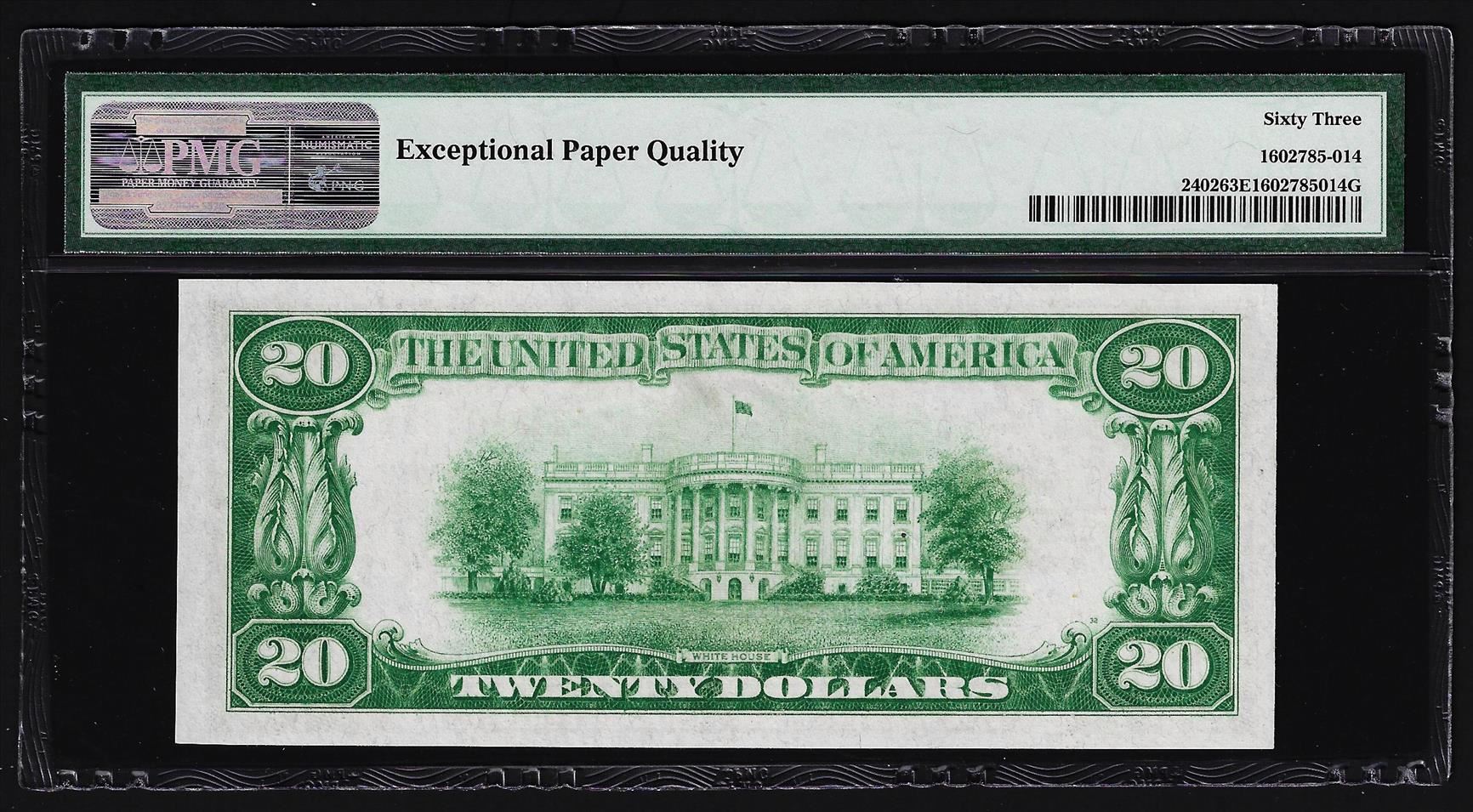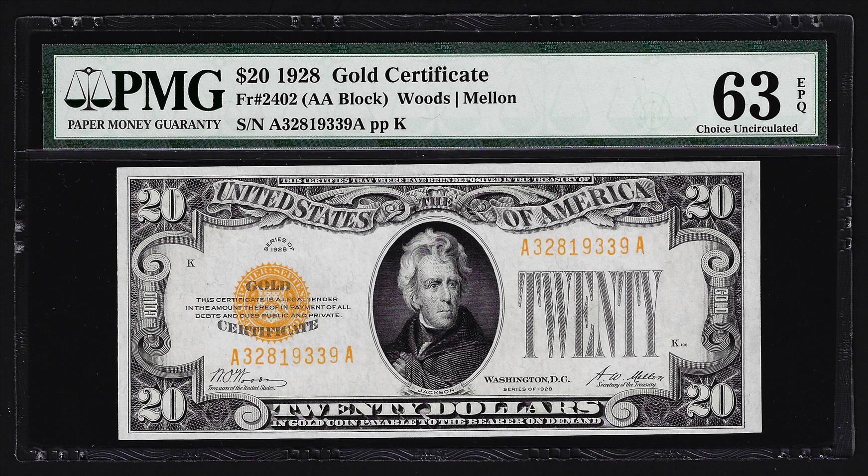 One 1928 $20 Gold Certificate Note PMG Choice Uncirculated 63EPQ. PMG Certified.