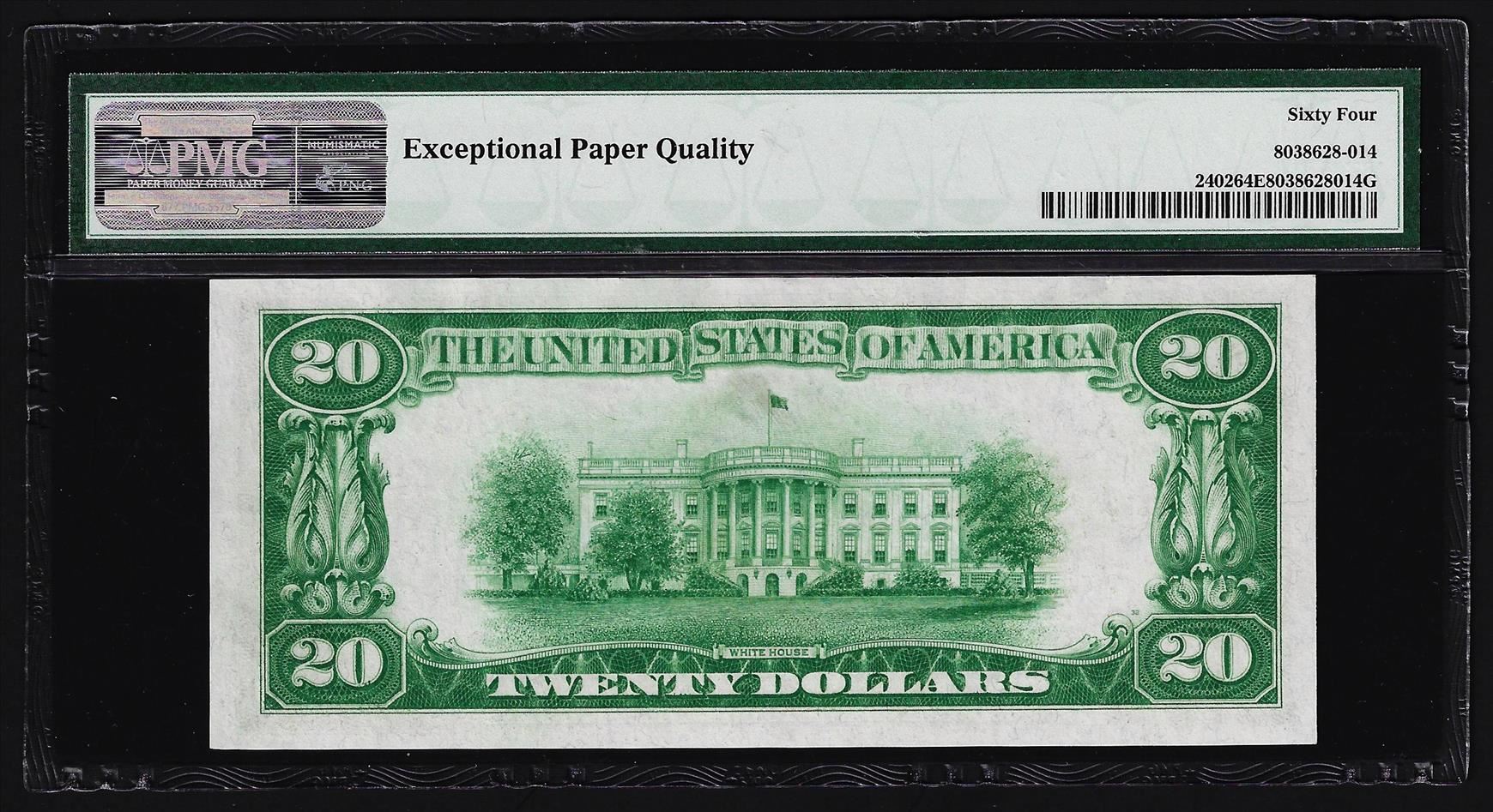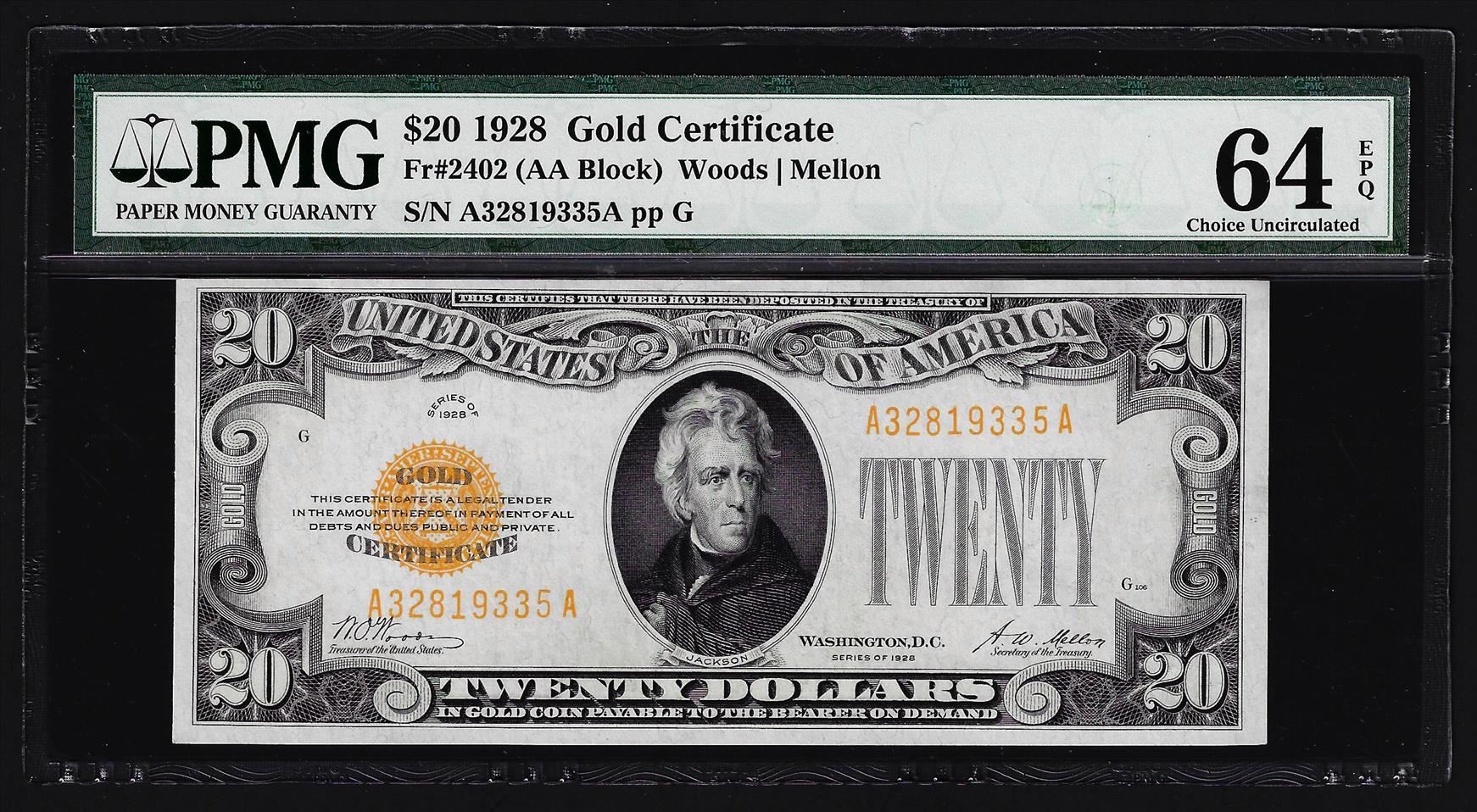 One 1928 $20 Gold Certificate Note PMG Choice Uncirculated 64EPQ. PMG Certified.