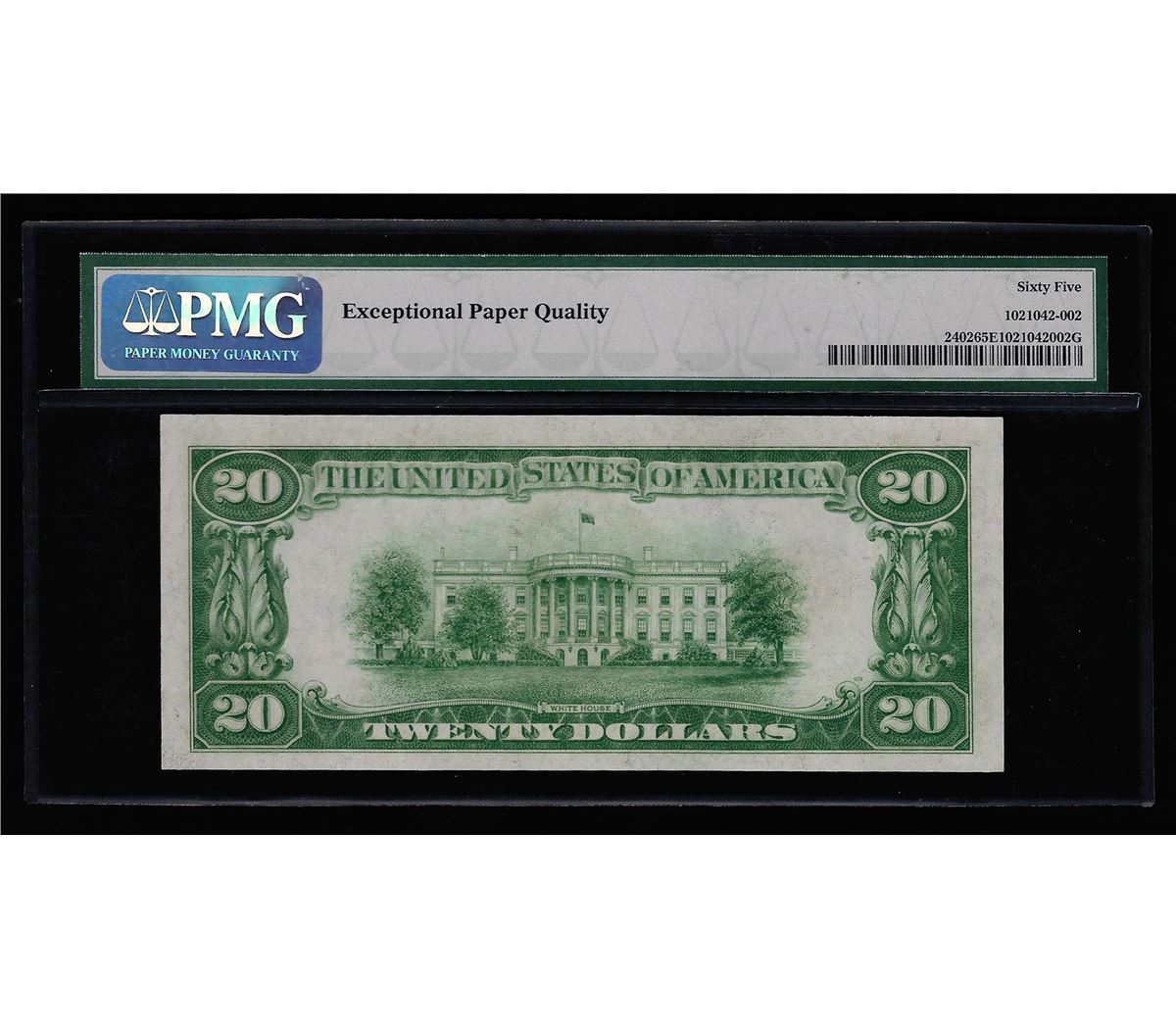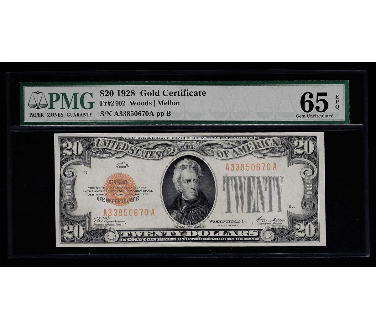 One 1928 $20 Gold Certificate Note PMG Gem Uncirculated 65EPQ. PMG Certified.